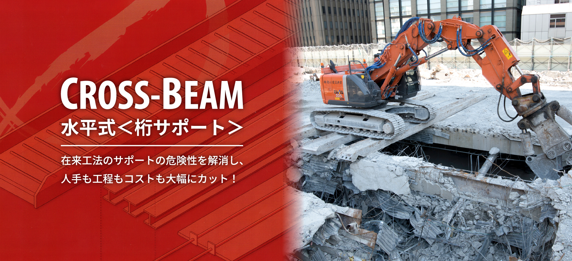 地上解体においては、桁サポート(クロスビーム)では使用できなかった55トン以上の解体機の使用が可能となり、地下にある建物や共同溝の補強工事を最小限に抑え、大幅な工期の短縮を図ることを可能となりました。